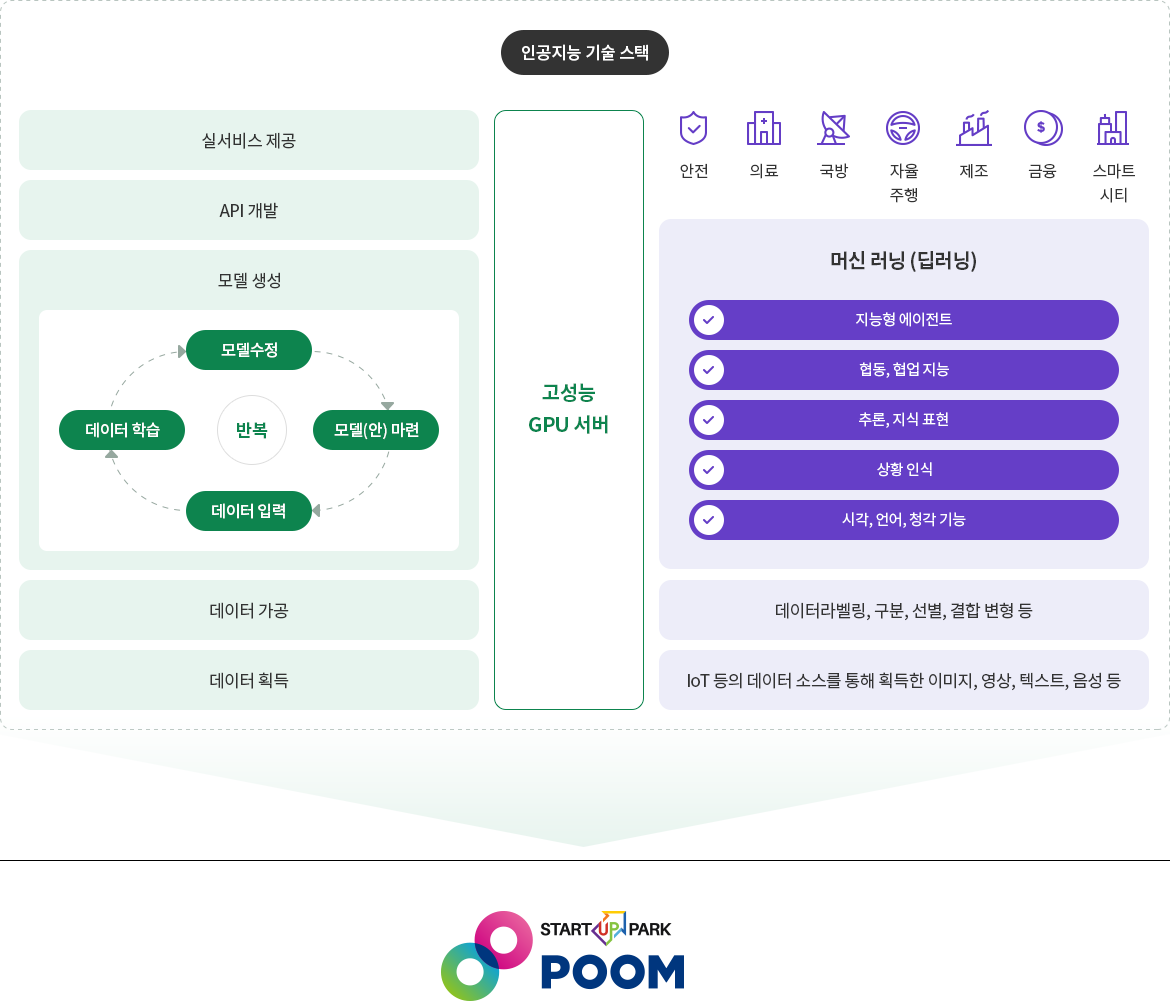 비즈니스모델에 AI 기술 적용을 희망하는 스타트업을 대상으로 맞춤형 기술 진단 및 수요 분석을 실시하여, 기업별 성장단계와 역량에 부합하는 전용 개발 인프라 (GPU, Cloud 자원 등)및 개발 프레임워크를 지원